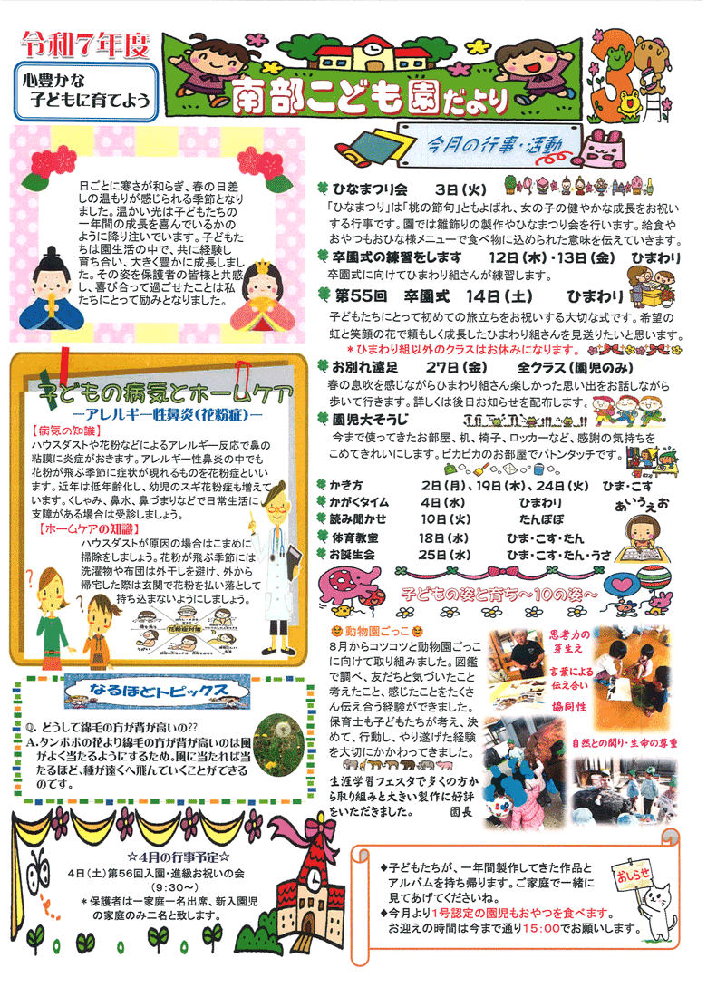 (0・1)ひよこ組のおしらせ(2)うさぎ組のおしらせ(3)たんぽぽ組のおしらせ(4)こすもす組のおしらせ(5)ひまわり組のおしらせ 南部こども園だより2026年3月