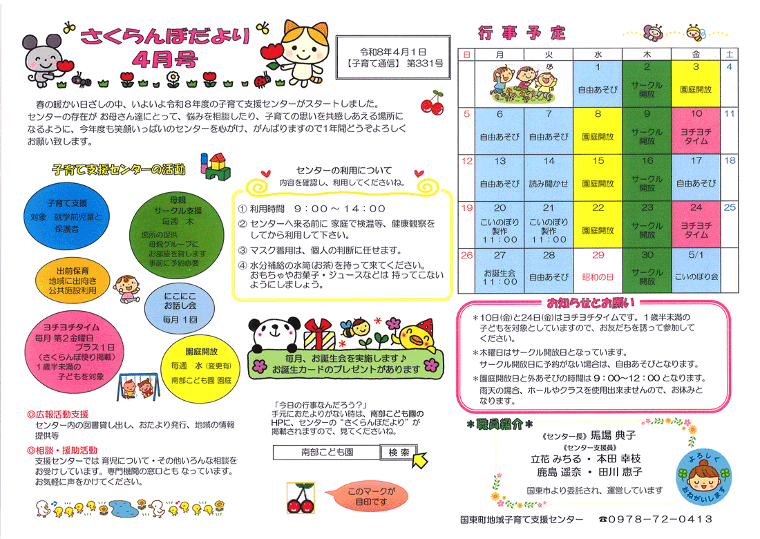 国東町地域子育て支援センターのおしらせ さくらんぼだより2026年4月