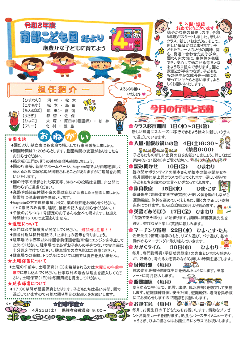(0・1)ひよこ組のおしらせ(2)うさぎ組のおしらせ(3)たんぽぽ組のおしらせ(4)こすもす組のおしらせ(5)ひまわり組のおしらせ 南部こども園だより2026年4月
